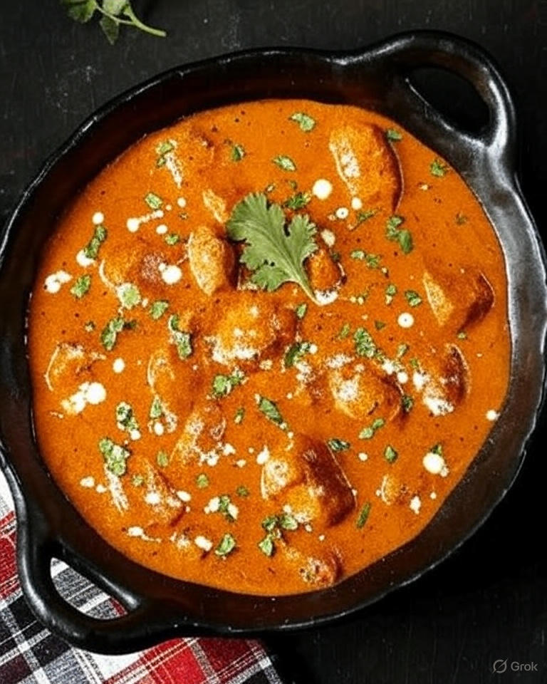 Tender chicken simmered in a rich, buttery tomato gravy for a classic indulgence.
