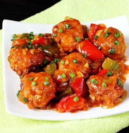 Juicy chicken tossed in a tangy, spicy Indo-Chinese Manchurian sauce for a zesty delight.
