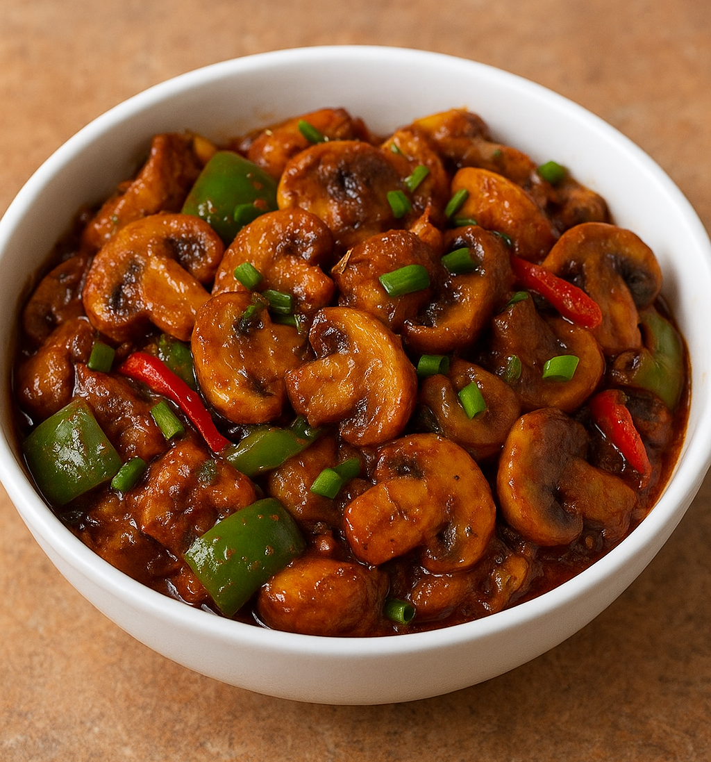 Spicy and flavorful Mushroom Chilli – crispy mushrooms tossed in a zesty Indo-Chinese sauce with peppers and onions.
